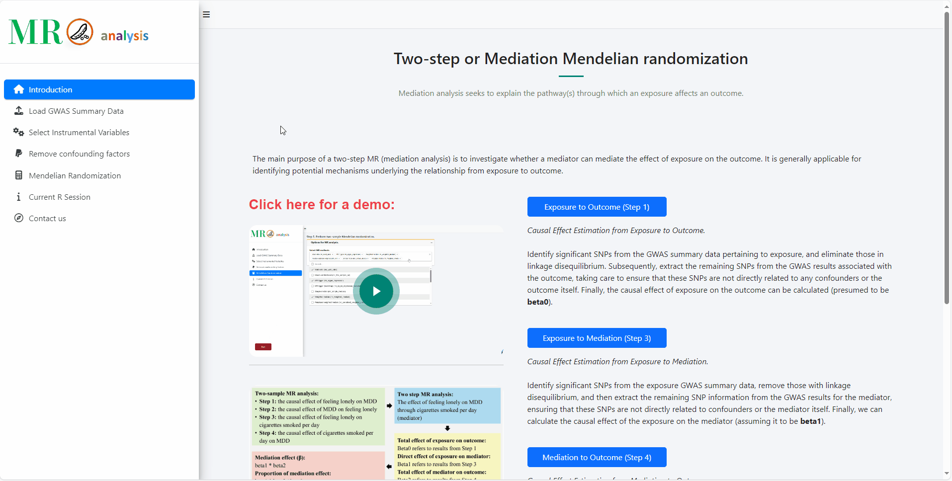 The main purpose of mediation MR is to investigate whether a mediator can mediate the effect of exposure on the outcome. It is generally applicable for identifying potential mechanisms underlying the relationship from exposure to outcome.