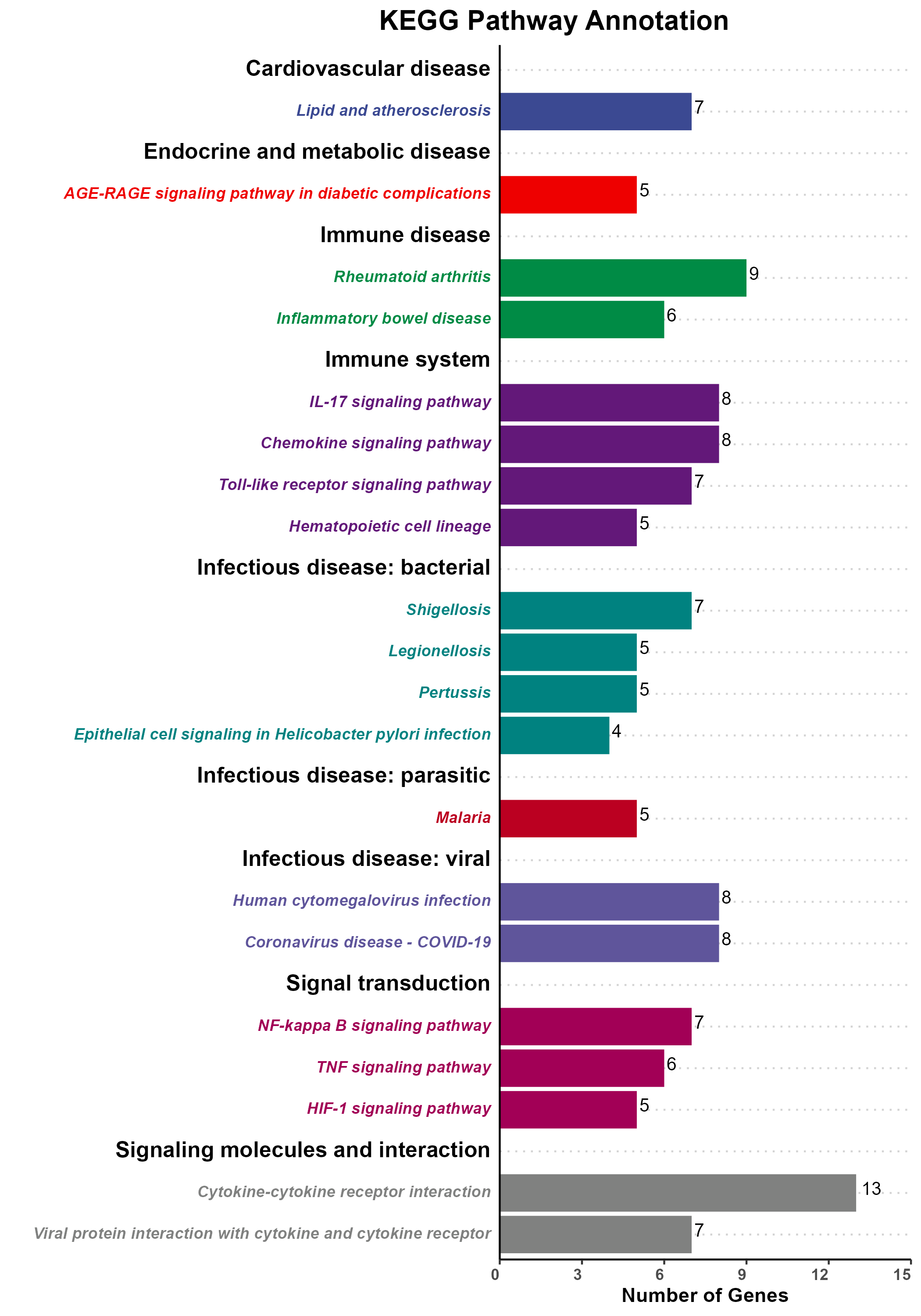 KEGG PATHWAY is a collection of manually drawn pathway maps representing our knowledge of the molecular interaction, reaction and relation networks for: 1. Metabolism; 2. Genetic Information Processing; 3. Environmental Information Processing; 4. Cellular Processes; 5. Organismal Systems; 6. Human Diseases; 7. Drug Development.